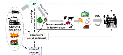 El 95% de la exposición de Dioxinas es transmitida a los humanos a través del consumo de alimentos de origen animal (carne, pescado, huevos y lácteos principalmente). También puede estar presente en agua y suelo.